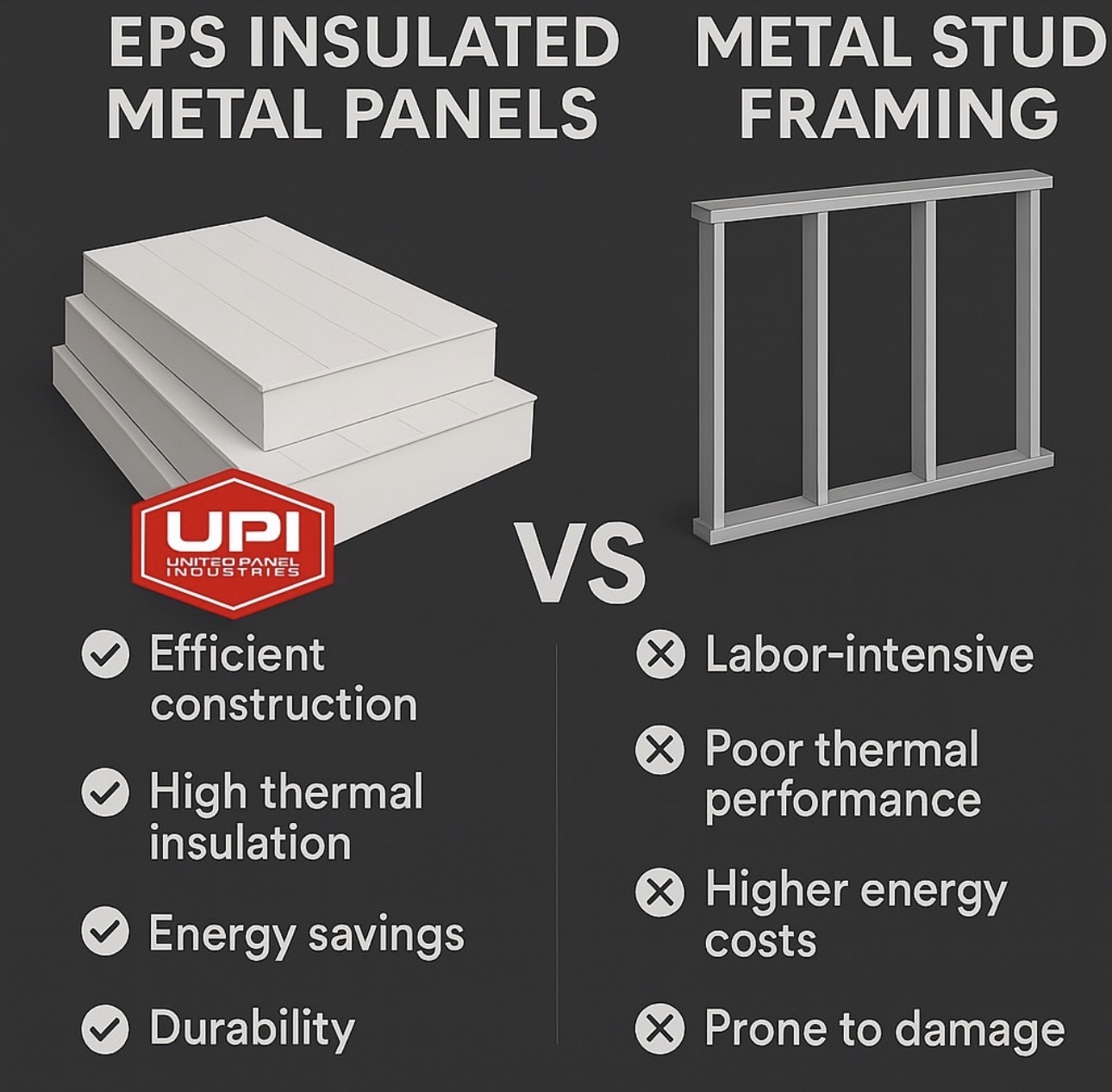 UPI Panels are designed with quality, efficiency, and durability in mind. Each panel features an EPS foam core bonded between two sheets of 26 gauge galvanized steel. This process not only creates a panel that is structurally sound with excellent thermal insulation, moisture resistance, and long term durability but offers A LIFETIME WARRANTY. With UPI Panels energy efficiency and sleek appearance, our panels are a smart and cost effective solution for all your building needs.