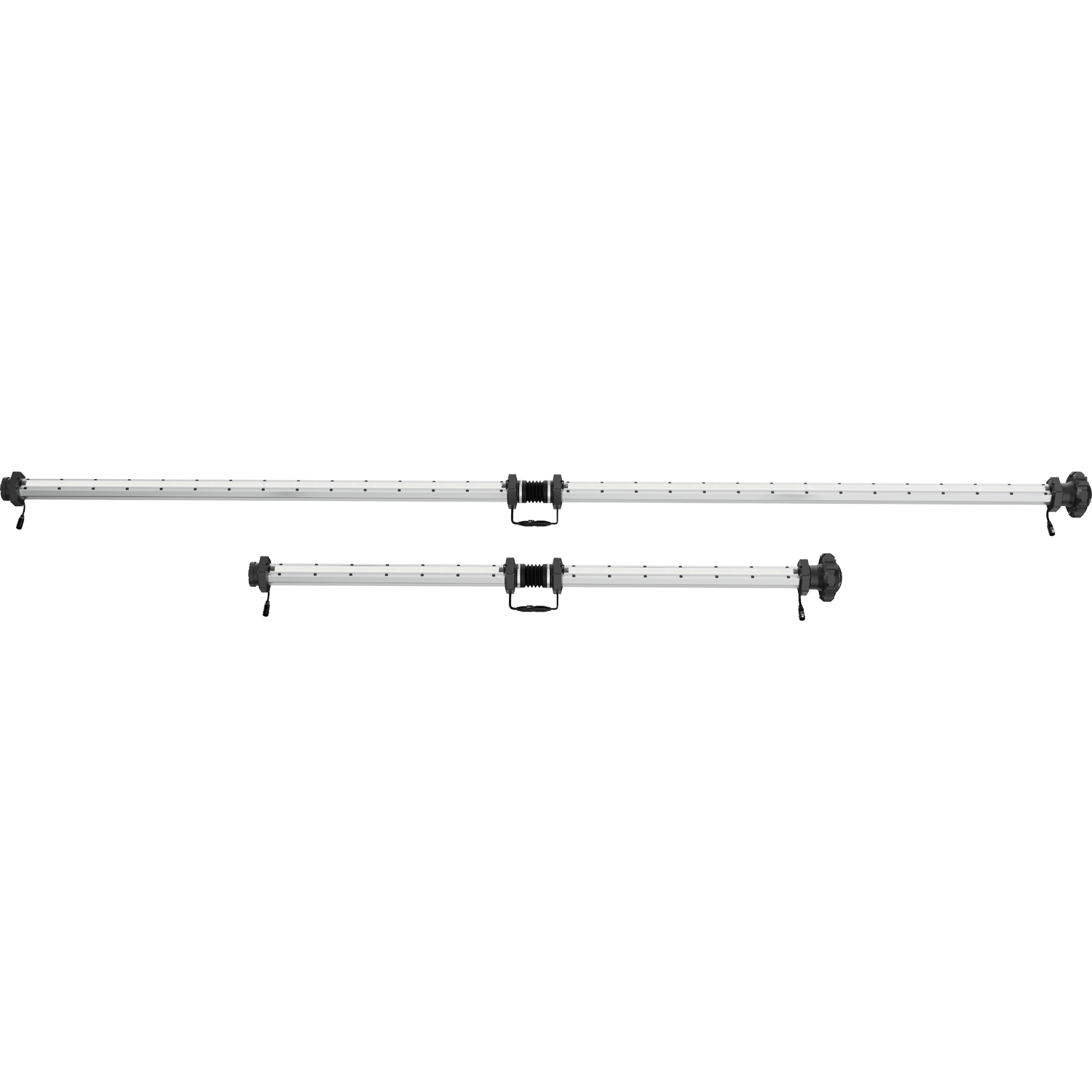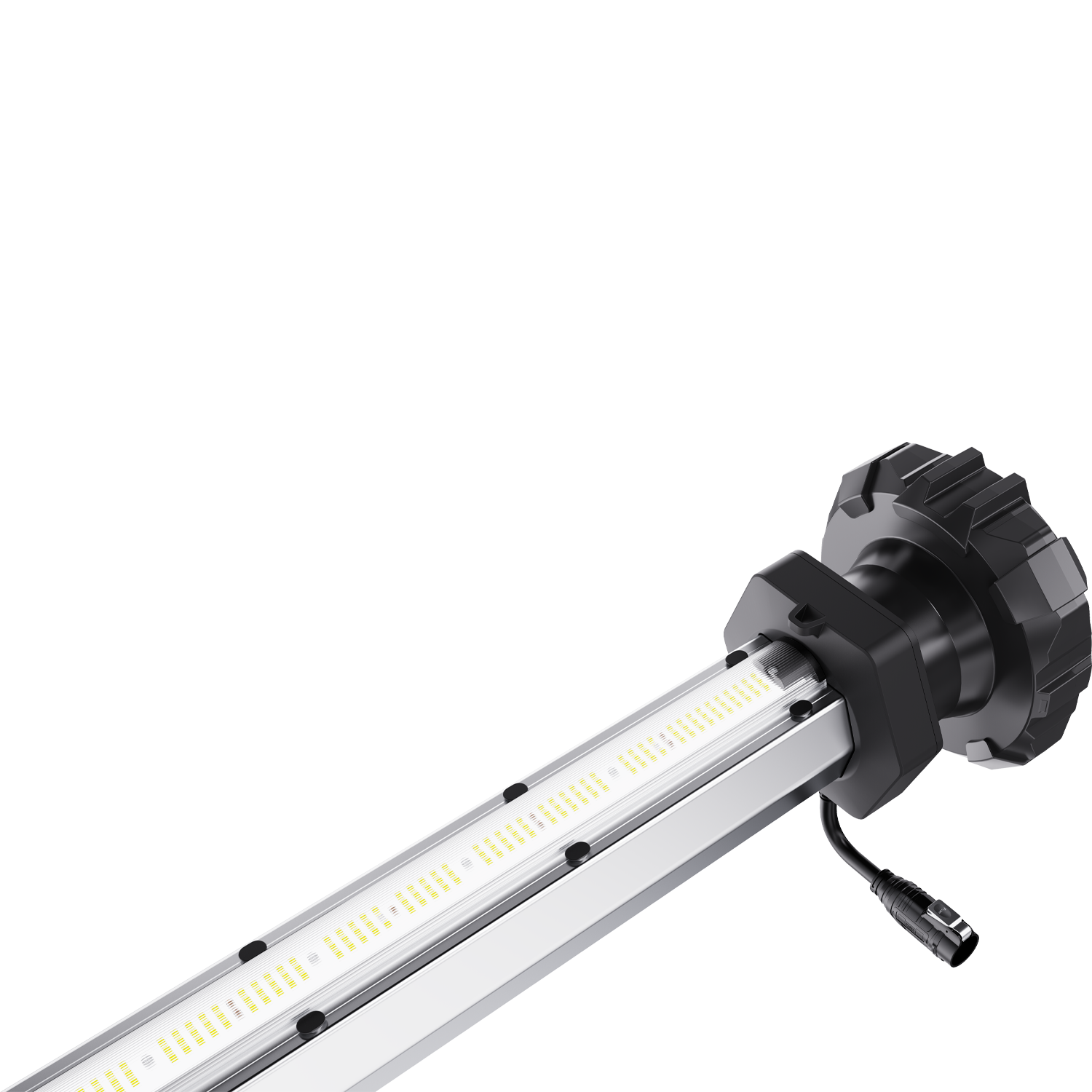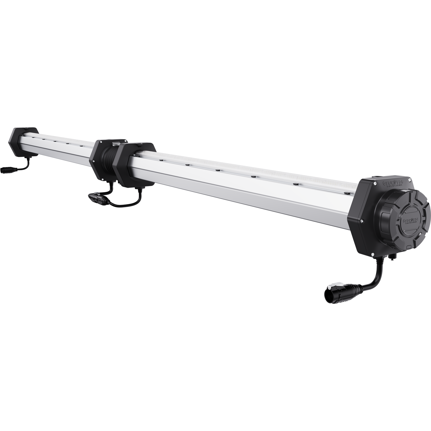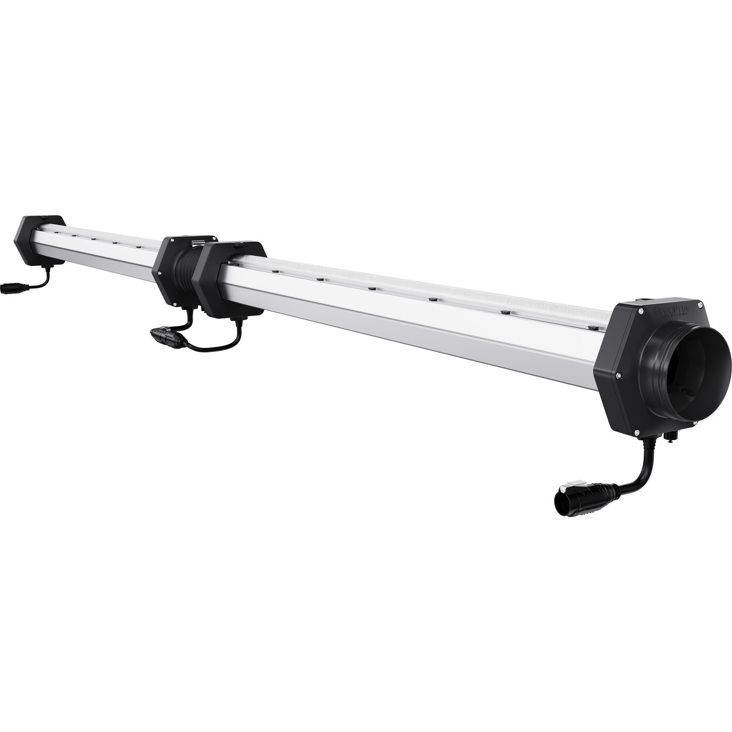 Each fixture has a tube end that connects to the next one using a rubber duct connector, so you can run them end-to-end along a bench or rack row. This creates a continuous airflow path while keeping the under-canopy lighting in line with the plants.