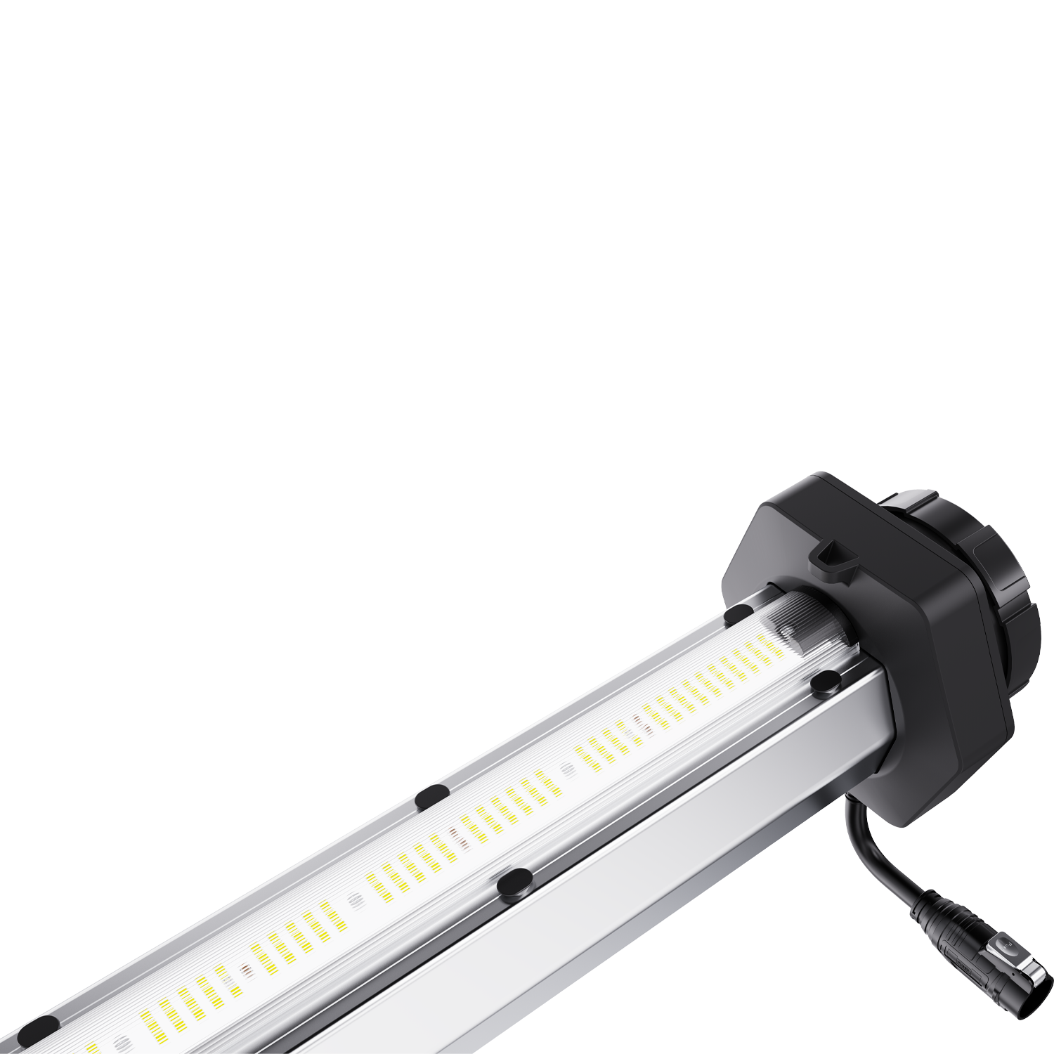 Each unit uses a built-in aluminum ventilation tube, making the fixture part of the under canopy air system, not just a light bar. Each fixture connects to the next using a rubber duct connector to create a continuous airflow path along the row.